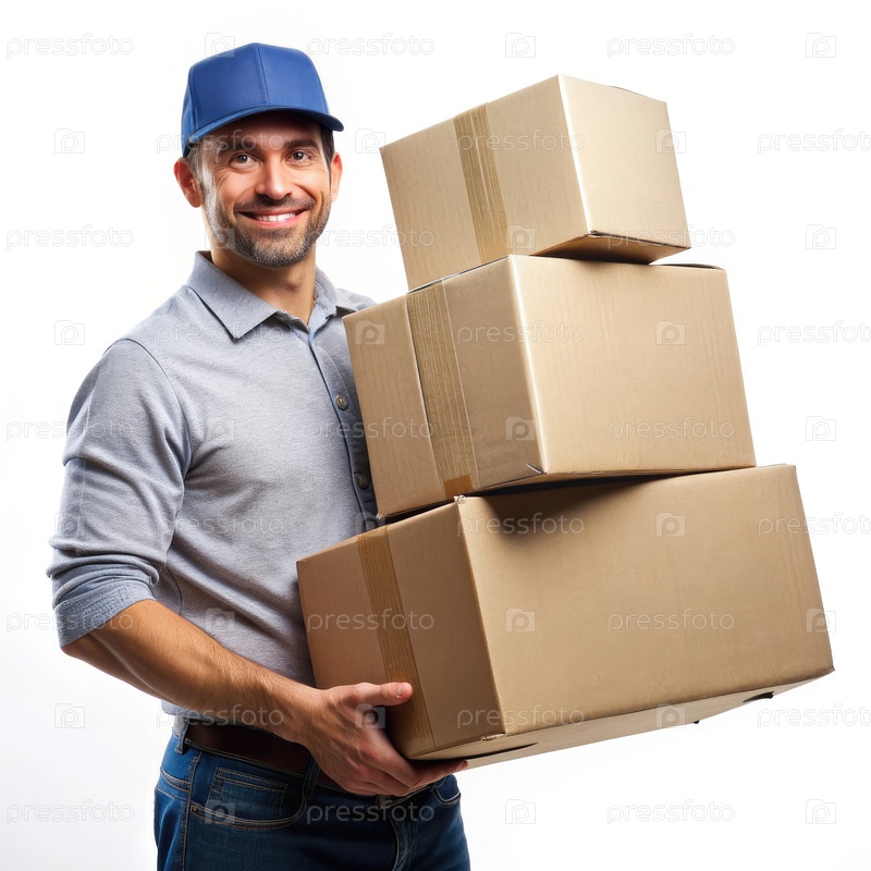 Улыбающийся доставщик, несущий картонные коробки на белом фоне