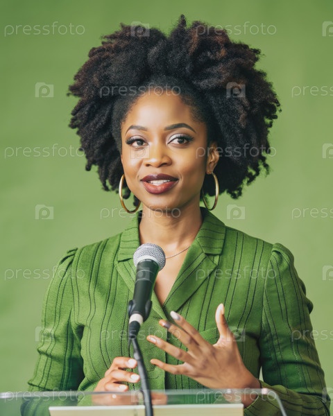 Усиленная африканская женщина выступает с мощной речью на мероприятии "Зелёный экран"