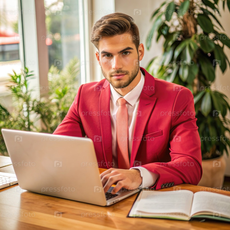 Молодой бизнесмен в красном костюме работает на ноутбуке в офисе