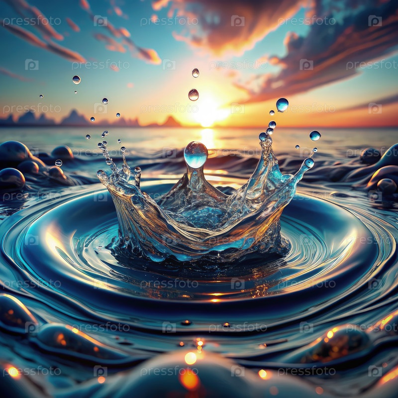 Капли воды брызгают в океан на закате. генеративный ИИ