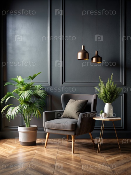 Темно-серая гостиная с удобным креслом и подвесными огнями
