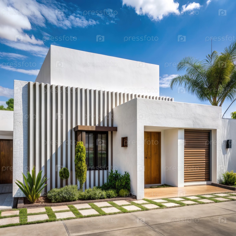 Мексиканский минималистический дом с белыми кирпичами и пышной зеленью. генеративный современный ИИ