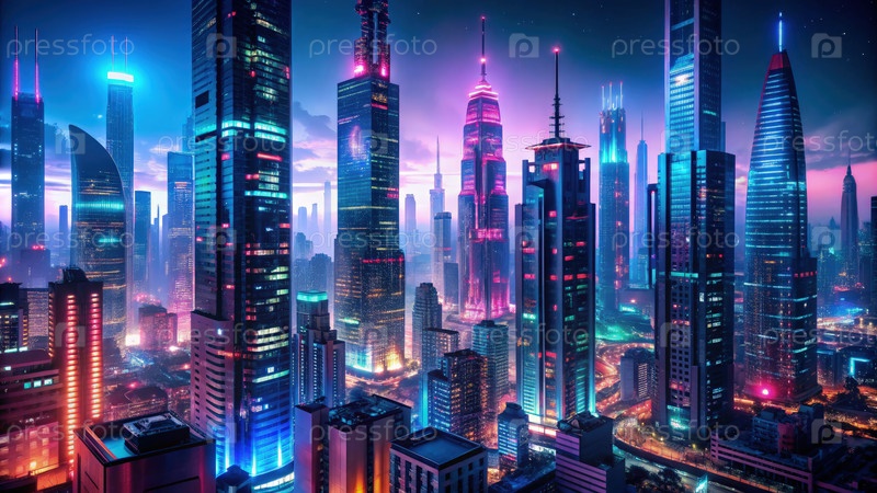 Киберпанкский городской пейзаж с освещенными небоскребами ночью. генеративный ИИ