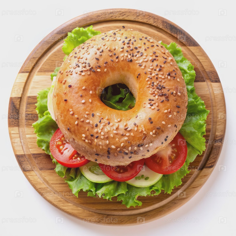 Свежеприготовленный бутерброд из багеля с помидором и огурцом на деревянной доске