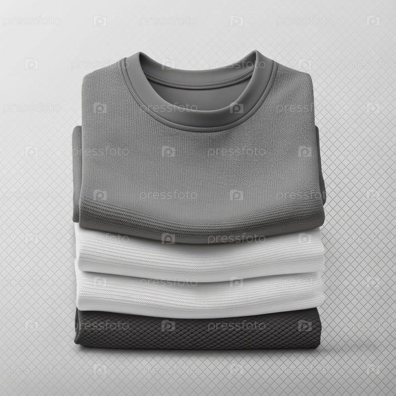 Стол сложенных серого, белого и черного футболок на светло-сером фоне