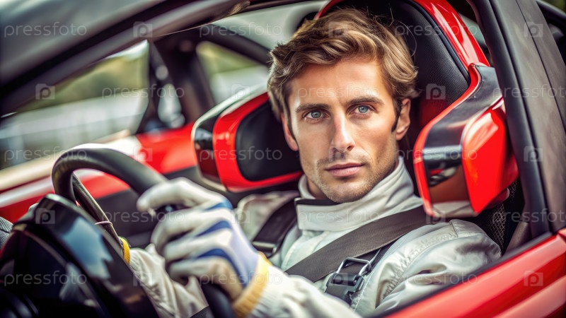 Молодой гоночный водитель сосредоточен на дороге вперед. генеративный ИИ