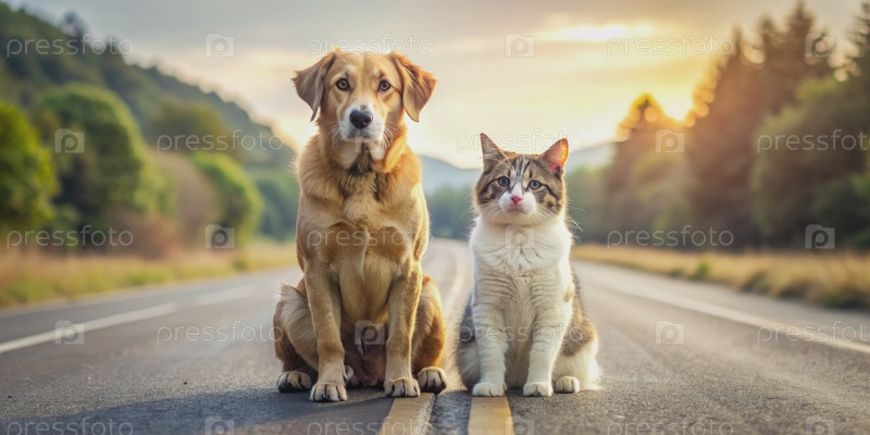 Золотая ретриверская собака и кот Табби сидят на дороге при закате