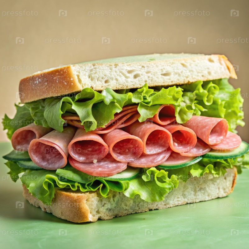 Сэндвич со саламой с салатами и огурцами на зеленой тарелке