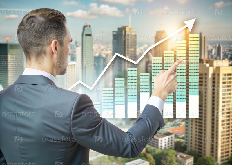 Бизнесмен указывает на график стрелки вверх в городской обстановке
