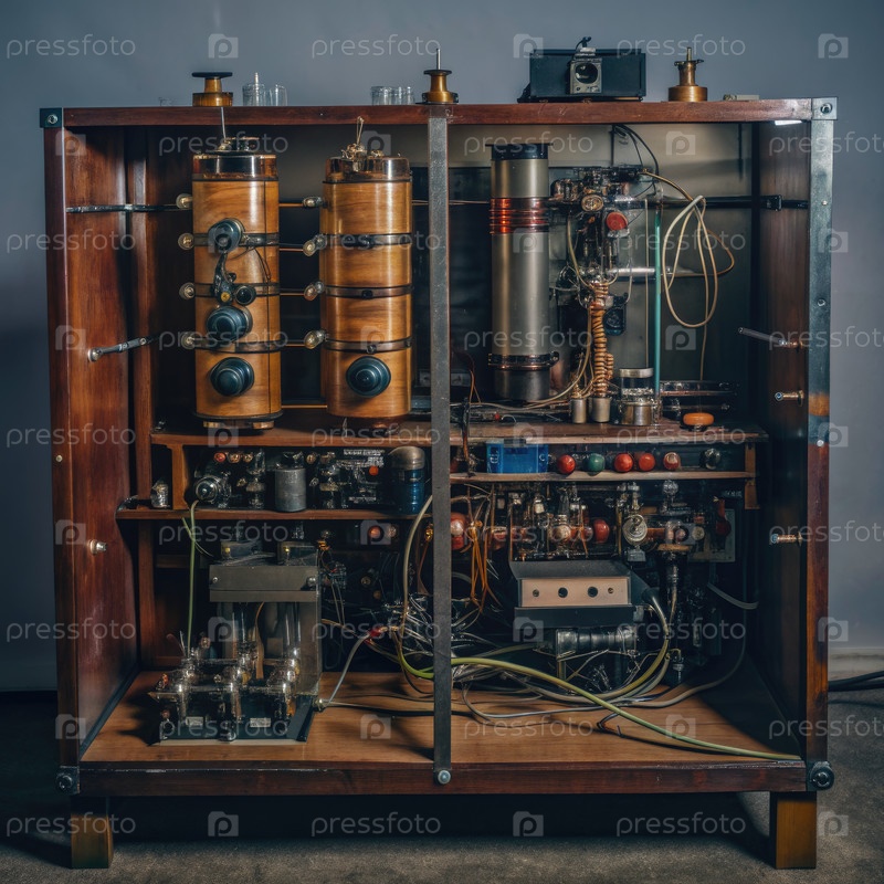 Ручно изготовленный экспериментальный компьютерный шкаф с открытой проводкой и вакуумными трубами. генеративная ИИ A