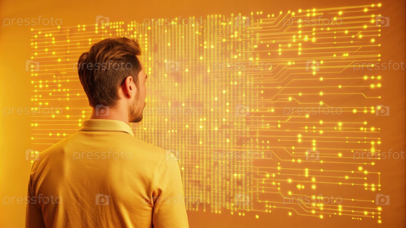 Человек наблюдает за проецированным схематическим листом на Желтой стене