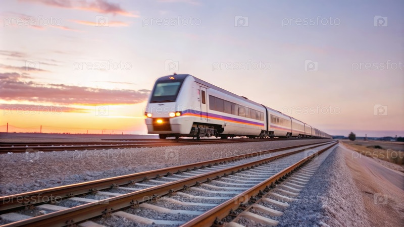 Пассажирский поезд, путешествующий по сельскому ландшафту на закате