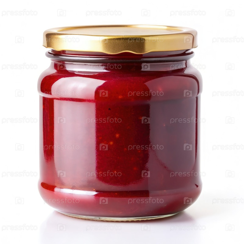 Бутылка из красного варенья с золотой крышкой на белом фоне
