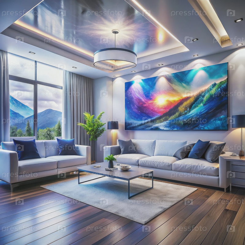 Современная жилая комната с видом на горы и абстрактное искусство. генеративный AI