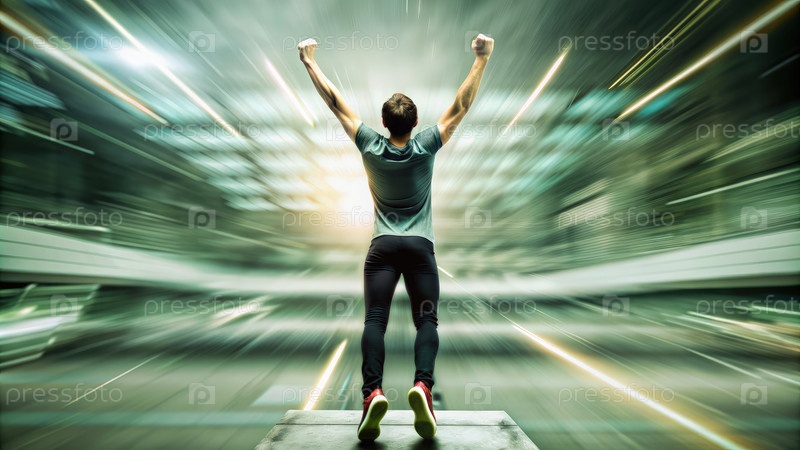 Человек празднует успех после преодоления препятствий на размытой дорожке