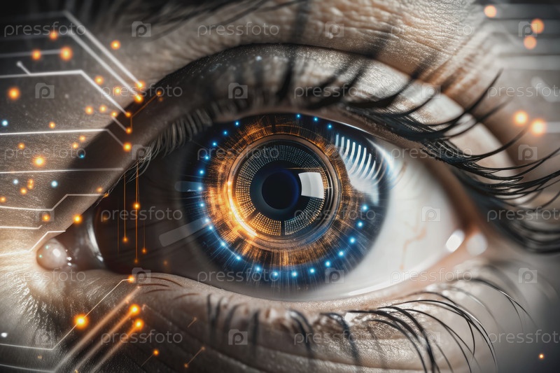 Ближайшая макрофотография человеческого глаза с футуристическим цифровым интерфейсом