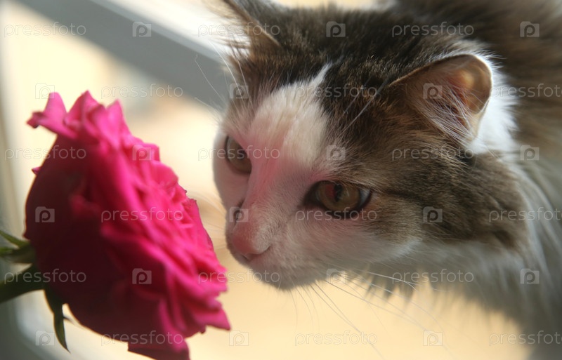 Кот, который нюхает красивую алую розу, крупный план