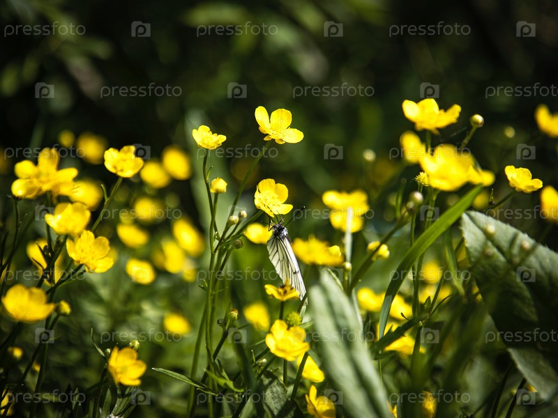 Цветущие лютики на лугу, бабочка на желтом цветке
