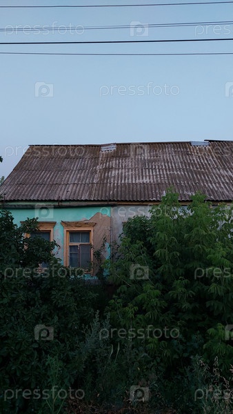 Деревянный старый дом с зеленым кустарником