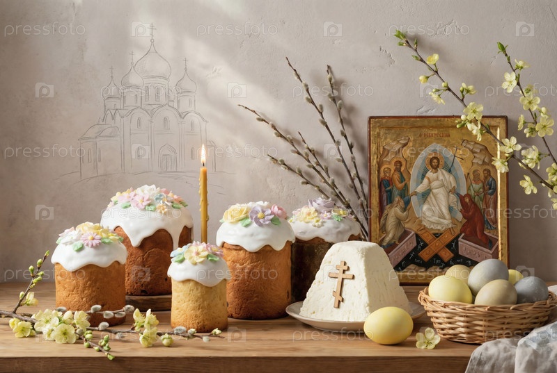 Пасхальные яйца, пасхальный торт, ива, цветы вишни и творог на серой стене с шаблоном храма.Концепция счастливой Пасхи 2026