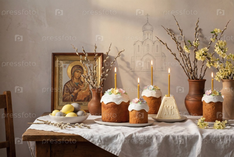 Пасхальные яйца, пасхальный торт, ива, цветы вишни и творог на серой стене с шаблоном храма.Концепция счастливой Пасхи 2026