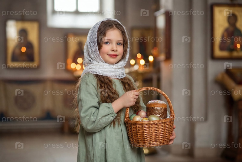 Религия и вера.Счастливого Пасхи.Портрет маленькой девочки в русском народном шарфе с плетеновой корзиной пасхальных яиц и пасхального торта внутри церкви