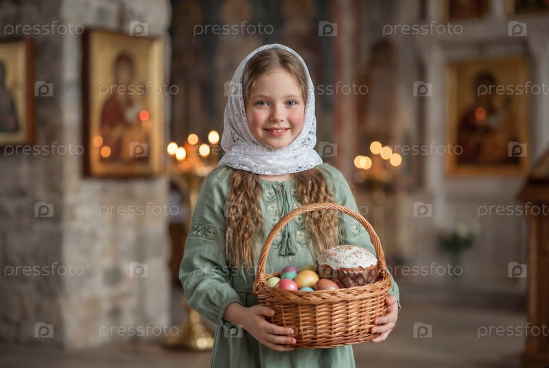 Религия и вера.Счастливого Пасхи.Портрет маленькой девочки в русском народном шарфе с плетеновой корзиной пасхальных яиц и пасхального торта внутри церкви