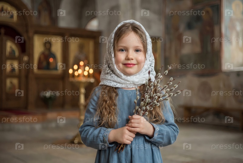 Религия и вера. Пальмовое воскресенье. Портрет маленькой девочки в русском народном плато с букетом верби внутри церкви