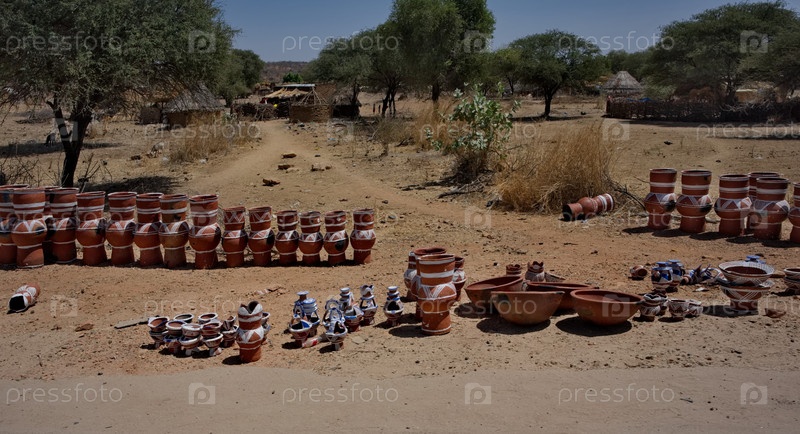 Монго, Чад, Вид на расписные глиняные сосуды различных размеров и формы, выставленные на продажу на обочине дороги