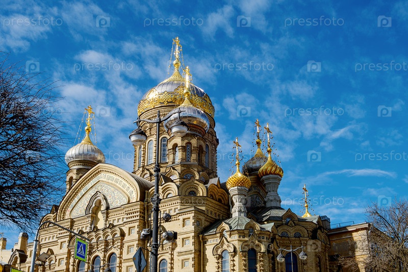 Санкт-Петербург, Россия - 21 марта 2026 года.Золотые купола церкви Успения Христова против голубого неба