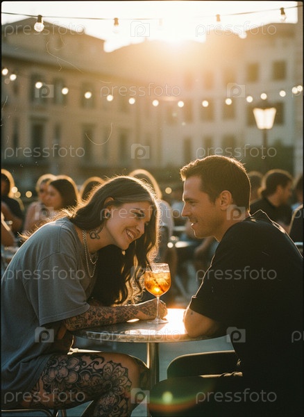 Пара сидит за столом с аперолем на веранде кафе и общается во время свидания на открытом воздухе в городе на закате