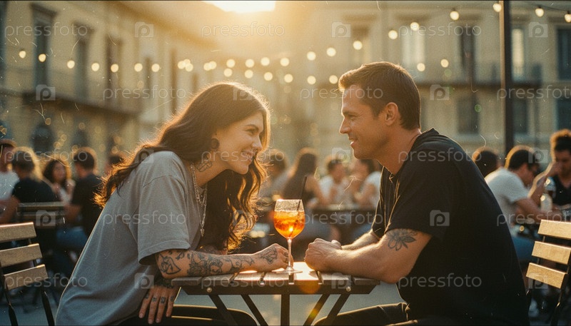 Пара сидит за столом с аперолем на веранде кафе и общается во время свидания на открытом воздухе в городе