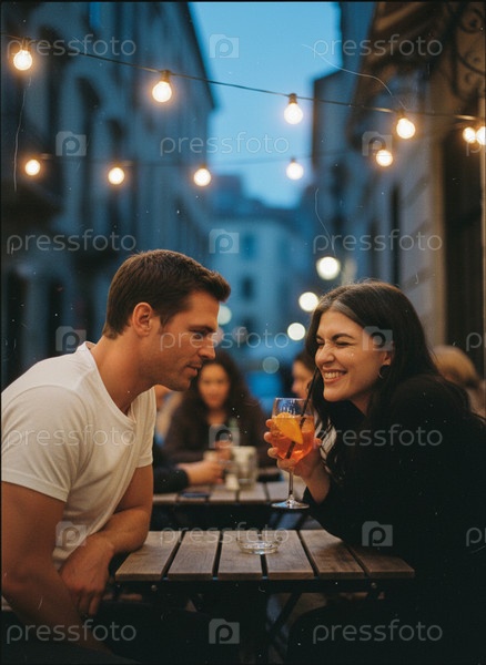 Пара сидит за столом с аперолем на веранде кафе и общается во время свидания на открытом воздухе в городе вечером