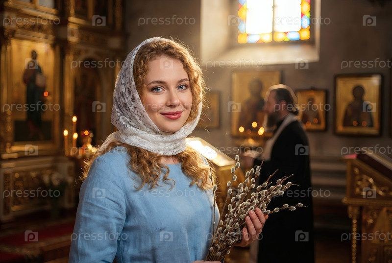 Религия и вера.Счастливой Пасхи.Портрет девушки в русском народном шарфе с плетеной корзиной пасхальных яиц и пасхального кулича внутри церкви