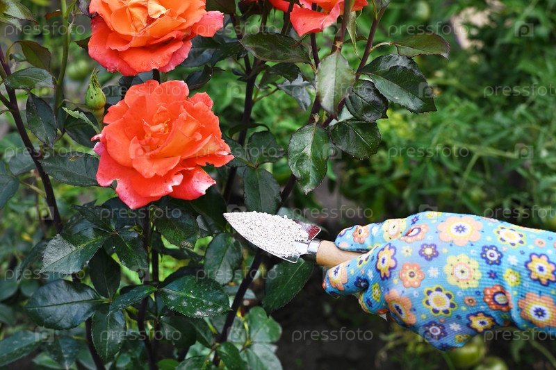 Садовник, применяющий почвенное удобрение к цветам роз в пышной садовой обстановке во время весеннего сезона