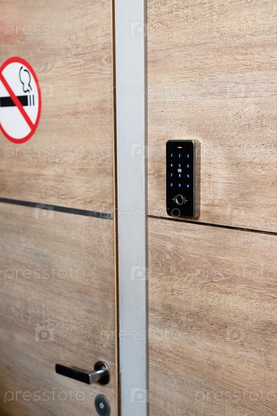 Клавиатура с сенсорным экраном, установленная на деревянной стене для безопасного контроля доступа в современных зданиях