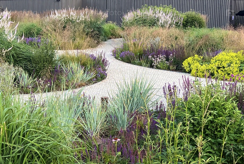 В безмятежном саду есть извилистый путь, окруженный разнообразными растениями и яркими цветами