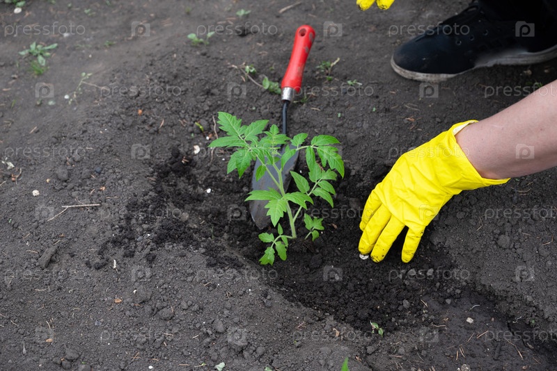 Руки пожилой женщины держат молодое растение в земле. В почве посажены саженцы томата. Близкий план. Концепция весеннего посева овощей и сельского хозяйства