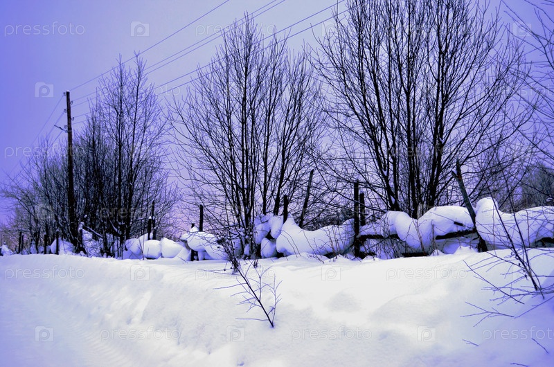 Сельский зимний пейзаж. Кустарники вдоль изгороди и линии электропередачи