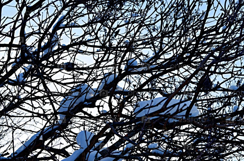 Заснеженные ветки кустарника, птички на ветках на фоне неба