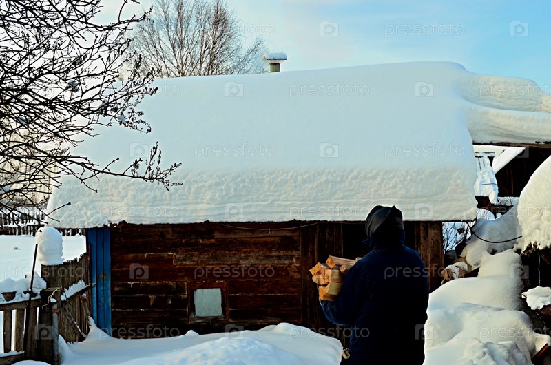Пожилая женщина несет охапку дров в деревенскую баню