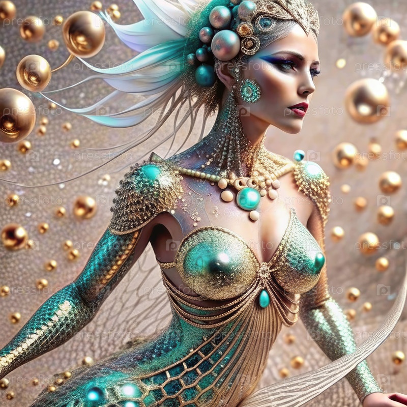Киберпанк Бионическая женщина в золотой и бирюзовой доспехах. генеративный ИИ