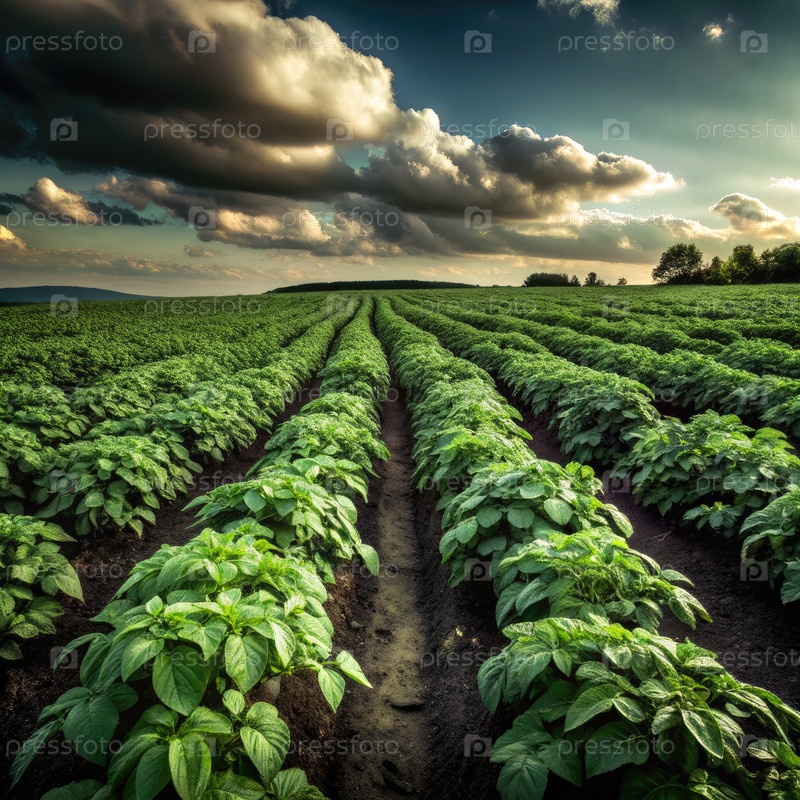 Ряд зеленых растений картофеля в поле на закате