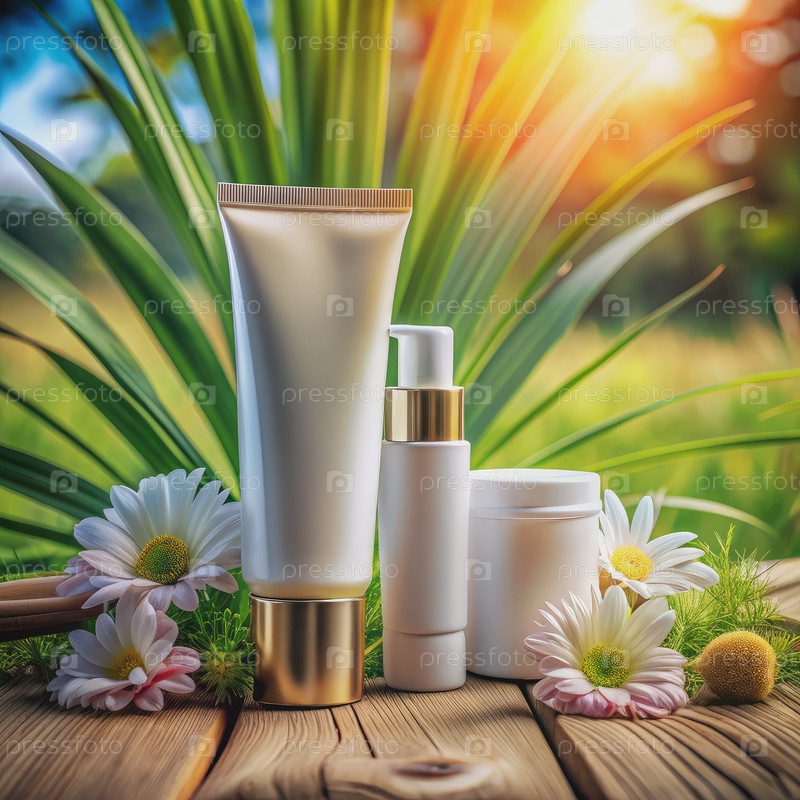 Мокет бутылок косметических продуктов на деревянной поверхности с цветами и зелеными листьями