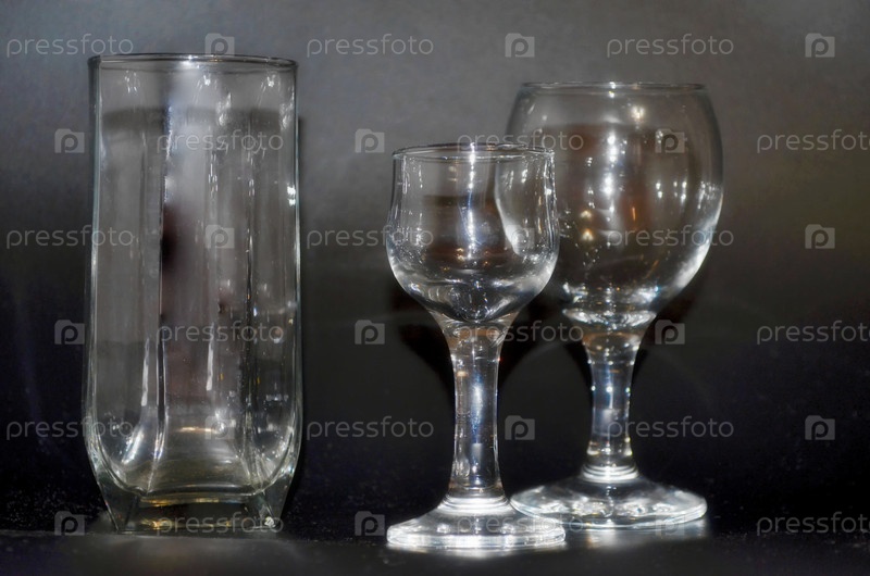 Готовые изделия из стекла, посуда, стакан, рюмки, бокалы на темном фоне