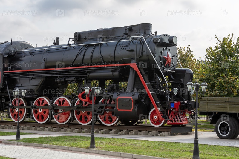 Старый советский паровоз в садовом и парковом комплексе в Назране