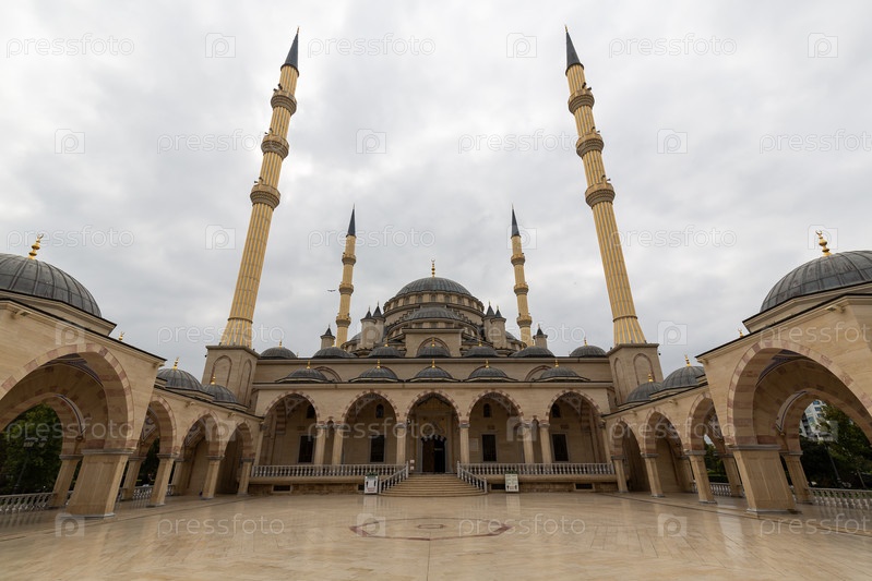 Вид на двор мечети Ахмеда Кадырова (официально известной как Сердце Чечни) в Грозном в пасмурный день, Чеченская Республика, Северный Кавказ, Россия