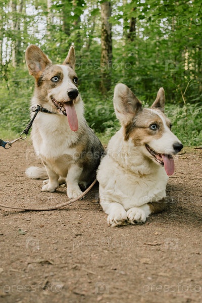 Две кардиганные собаки Welsh Corgi гуляют в парке со своим хозяином на повязках, профессиональным прогуливателем