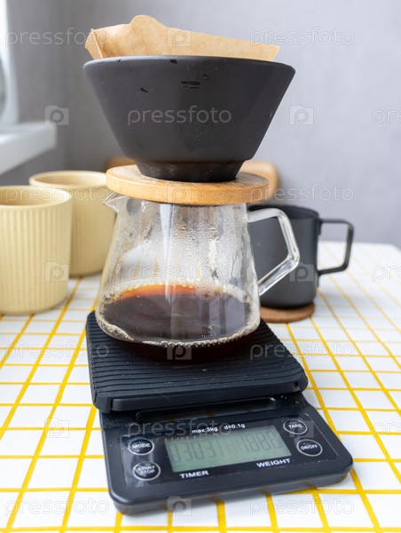 Кофе изготавливается из кофейных зерен. человек делает кофе через бумажный фильтр, наливает или капает
