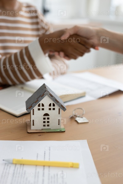 Рукопожатие между двумя людьми, заключение договора продажи недвижимости